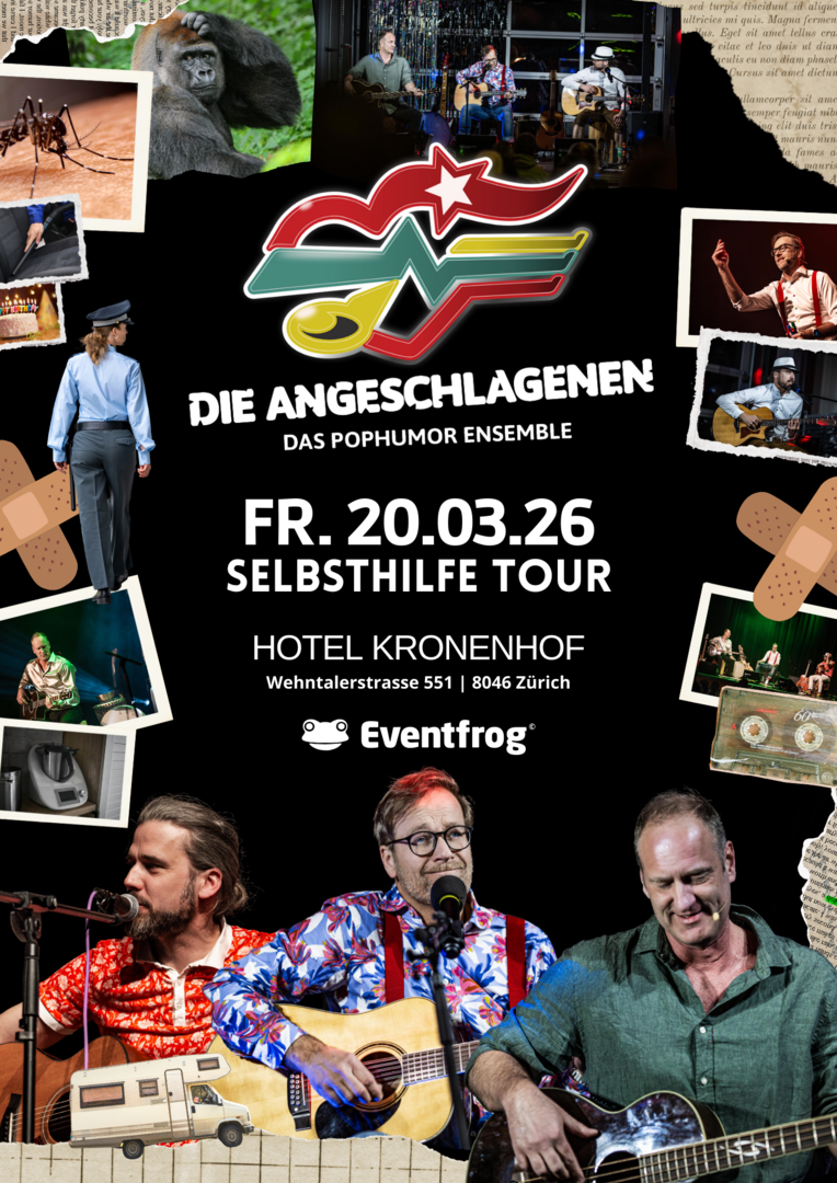 Erlebe Die Angeschlagenen mit ihrem witzigen Pop-Humor-Projekt, voll mit lustigen Liedern und humorvollen Geschichten über alltägliche Themen. Unterhaltung, bei der man viel lachen, klatschen und mitsingen kann. Ein Abend voller Storys, die uns alle irgendwo wiedererkennen lassen. Von alltäglichen Geschehnissen bis hin zu unseren Schwächen und Unzulänglichkeiten – die Angeschlagenen bringen sie charmant auf die Bühne.